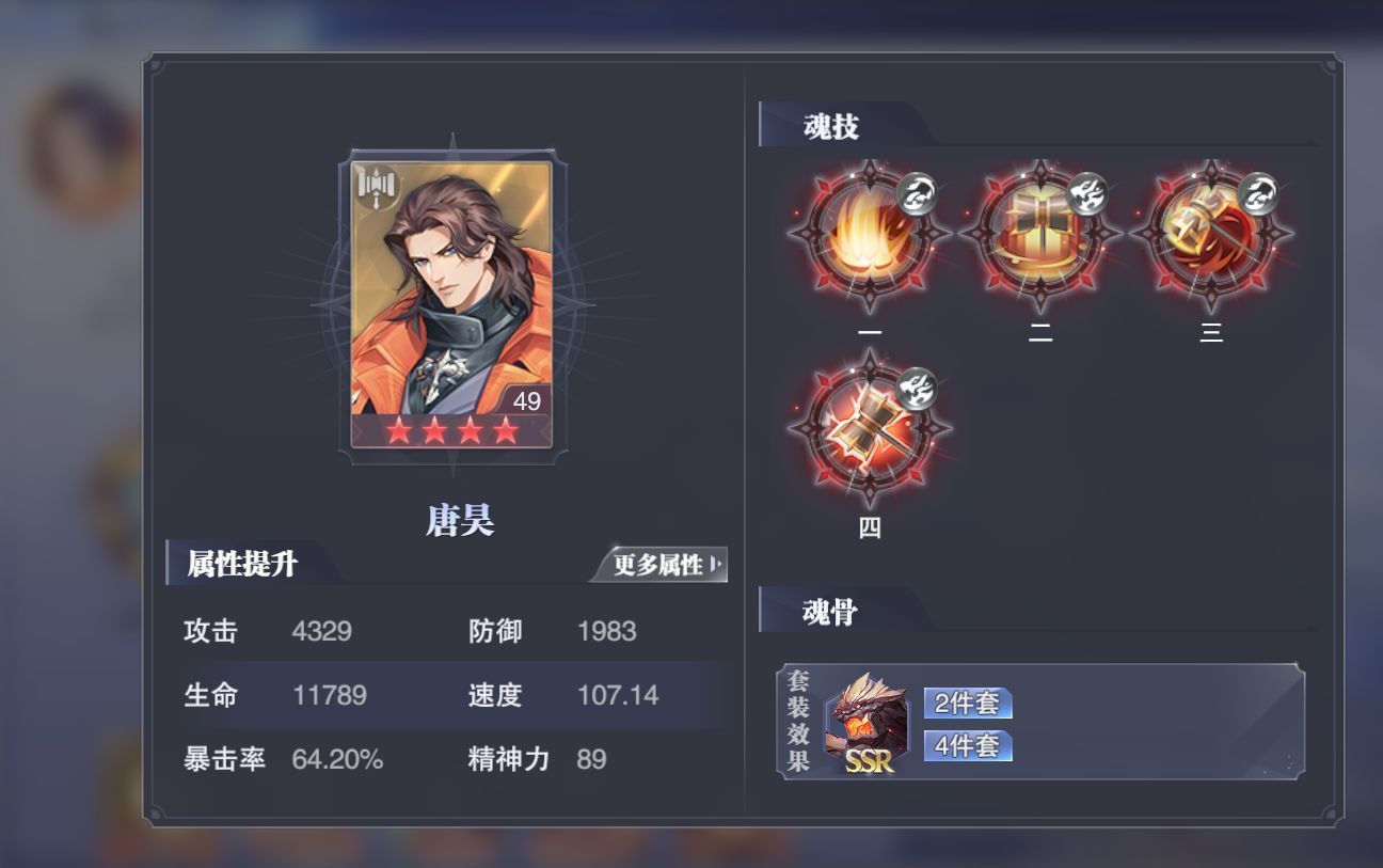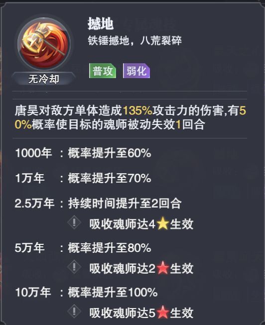 核心技能是第二魂技,红二星能够刚好出发第二魂技5w年功能+80速度,星级越高能加的速度越高,不过独孤博很克制火舞。