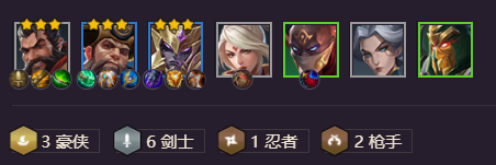 2、阵容分析:六剑士与二枪手配合太厉害了,其中无畏重炮要用金铲子+反曲之弓合成剑士羁绊,一定要凑出来,还有3豪侠,不管对战输赢一直给你提供额外金币,为刷牌升级提供一定基础。