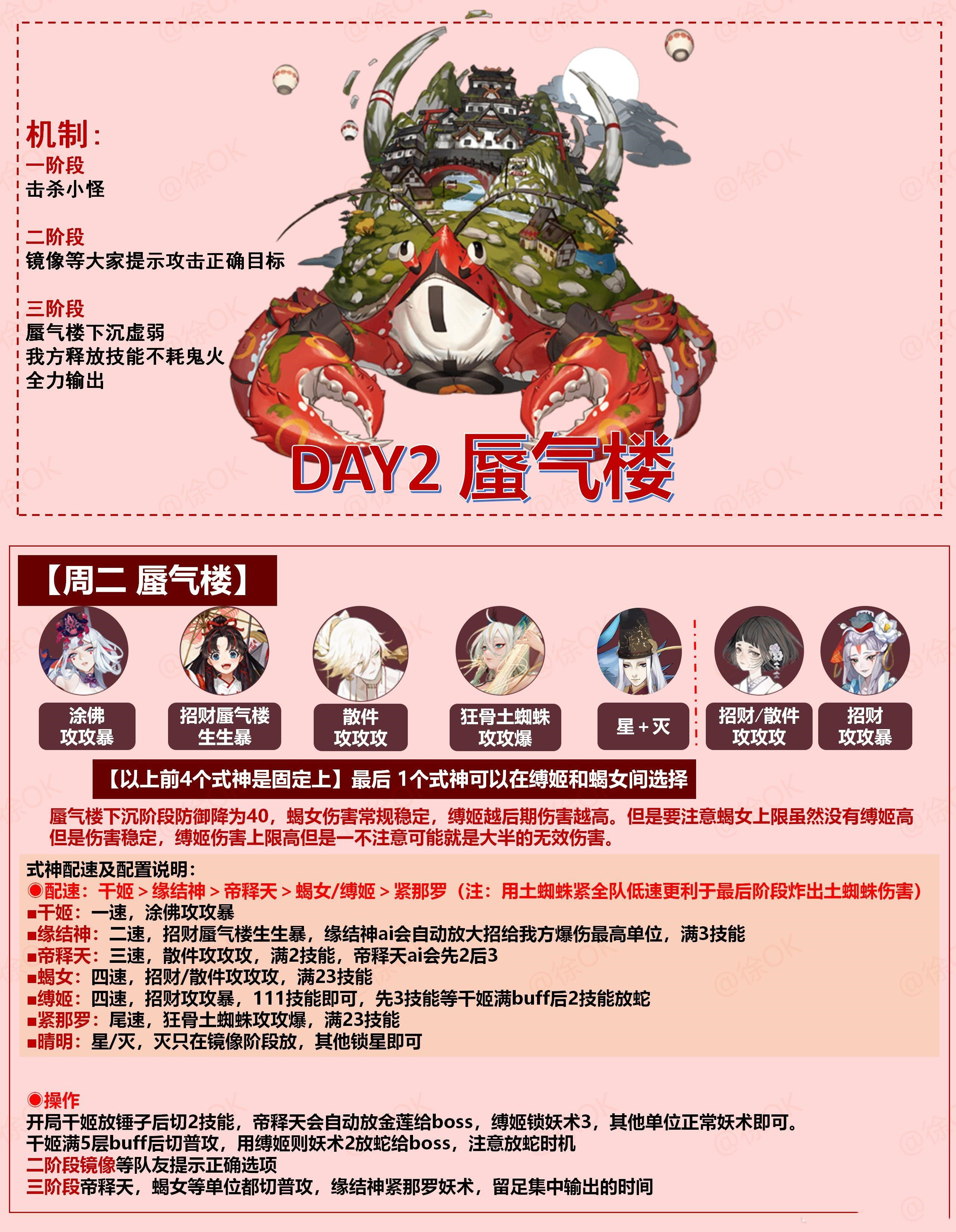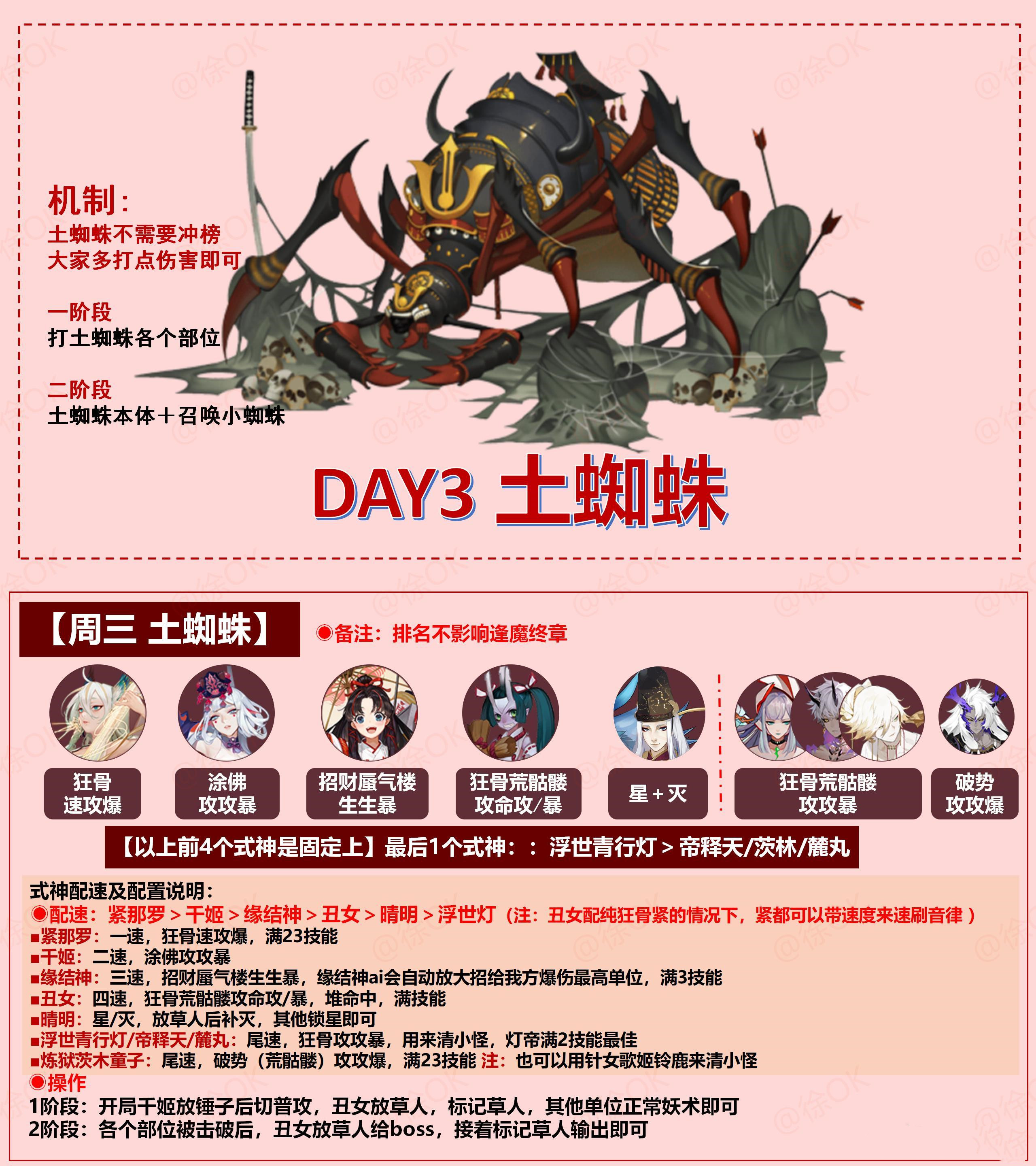 2阶段:干姬普攻boss,丑女草人放给小怪(小怪防御更低,打出来的伤害更高),用帝释天则放金莲给对应小怪即可晴明先灭后星,我方标记草人输出即可。
