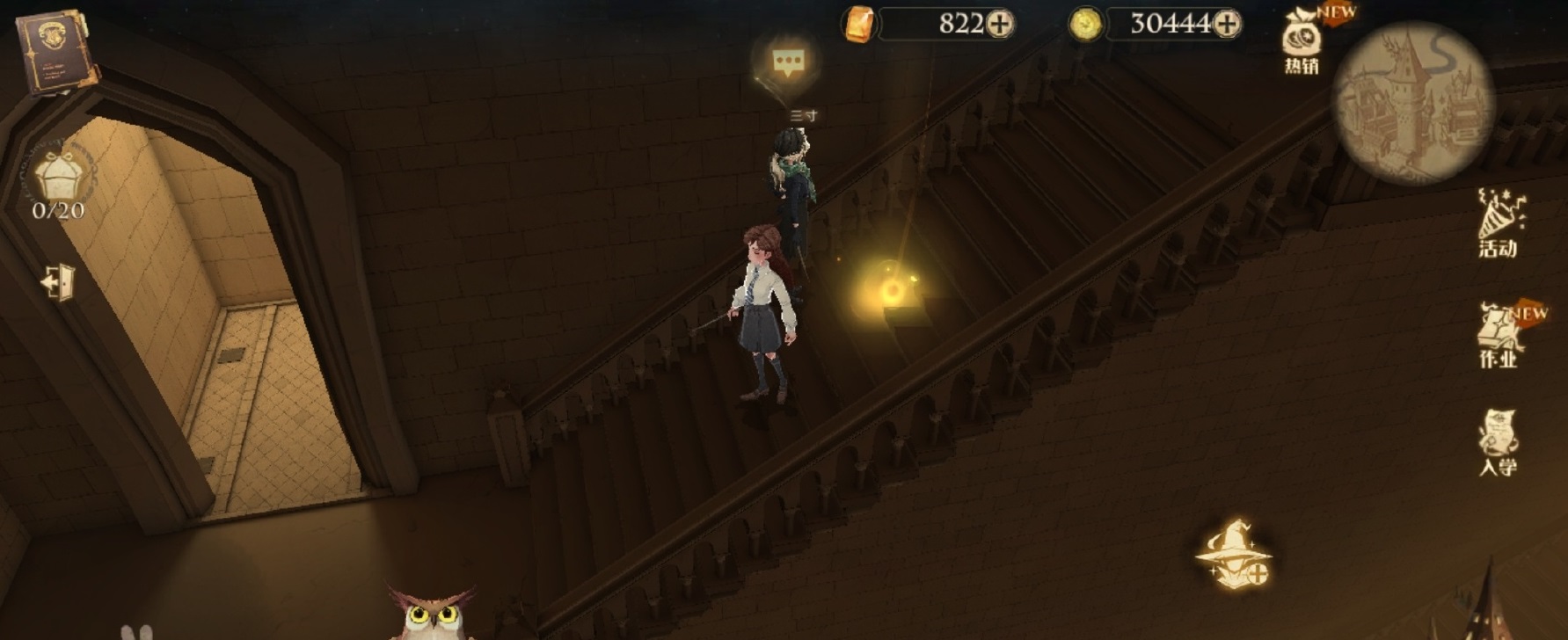 在城堡主楼,走到魔药课教室和斯莱特林休息室之间的楼梯上,点击光圈即可
