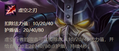 3、技能效果:虚空行者朝目标攻击,1星时、2星时、3星对敌人分别扣除10、20、40法力值,为自己添加20/40/80点的护盾。(如下图所示)