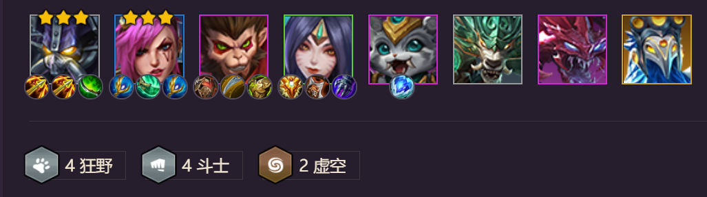 2、阵容分析:四狂野四斗士有肉有控制有输出,二虚空配合打出真伤,虚空行者组织敌方使用技能,此阵容顺利打赢敌方。