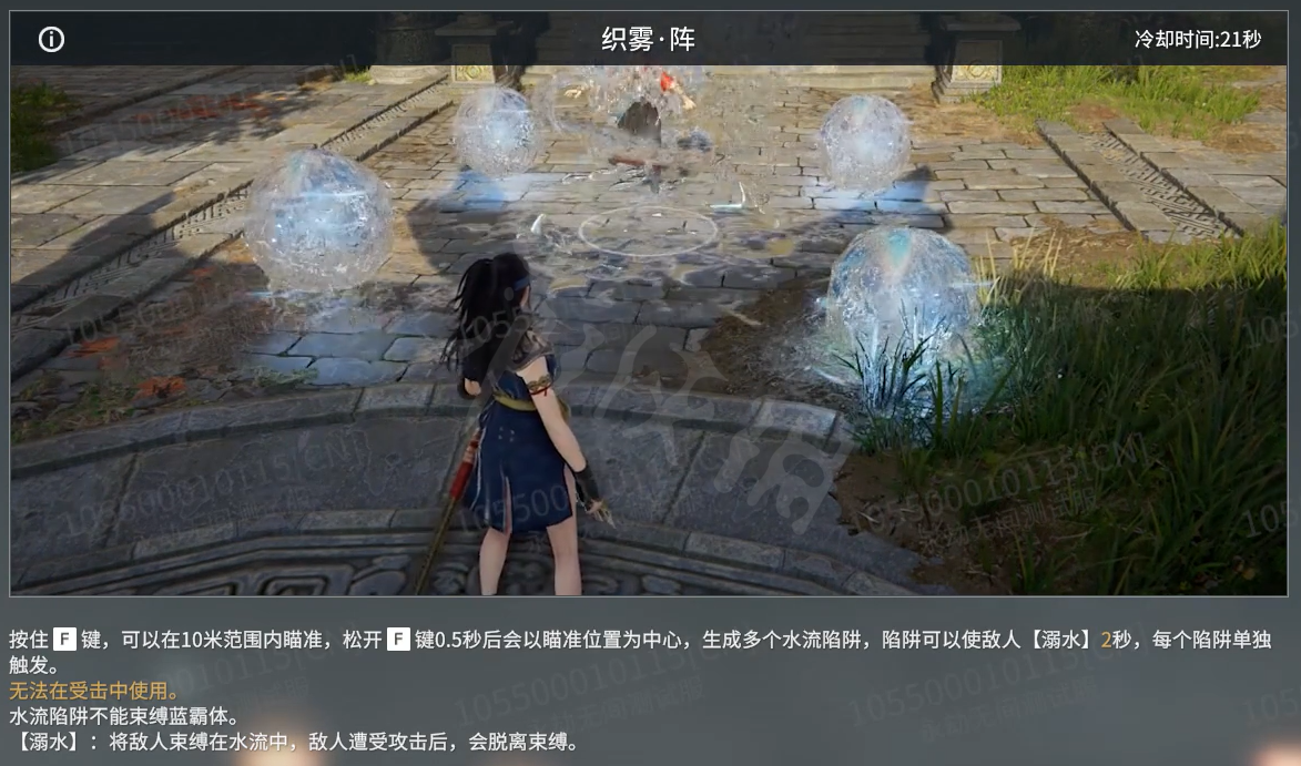 按住F键,可以在10米范围内瞄准,松开F键0.5秒后会以瞄准位置为中心,生成多个水流陷阱,陷阱可以使敌人【溺水】2秒,每个陷阱单独触发。