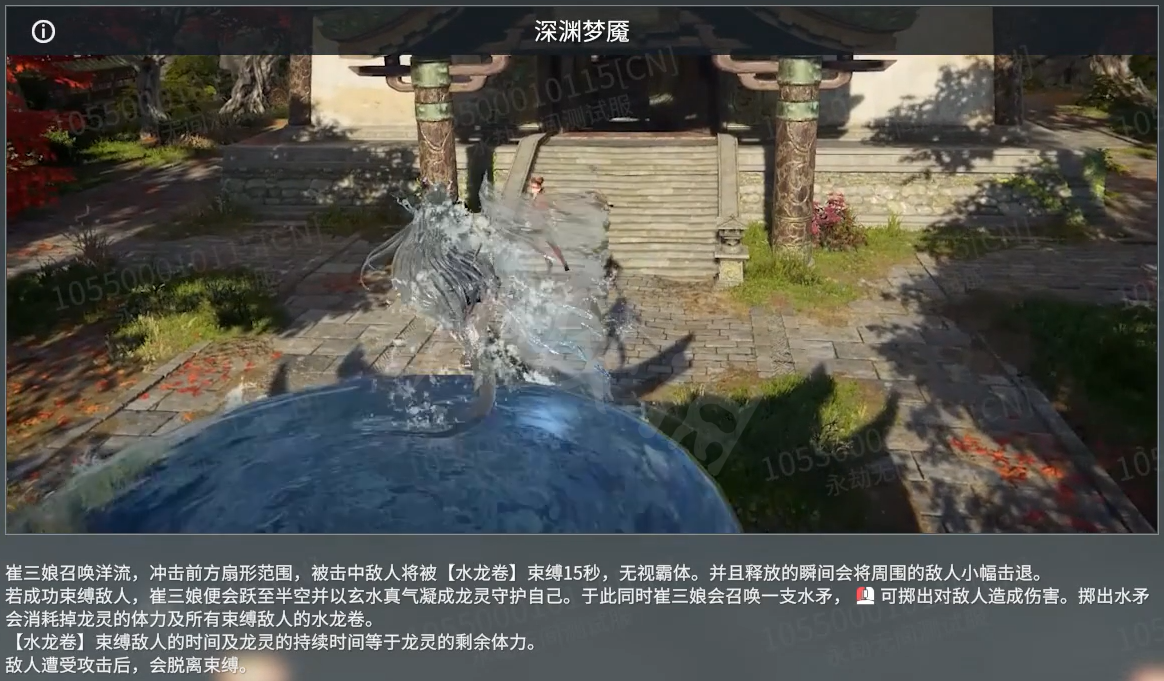 崔三娘不再召唤洋流,而是以玄水真气凝成龙灵守护自己并将自己带到半空,释放的瞬间会将周围的敌人小幅击退。于此同时崔三娘会召唤数支水矛,可掷出对敌人造成伤害并使其被【水龙卷】束缚6秒,无视霸体。