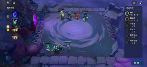 双方形势:对方4人,2星曙光+2星泰坦+1星波比+2星锤石,曙光和波比都带重骑转职,组成4骑士2重骑羁绊;我方3人,2星维恩2名,再加2星人马,一名维恩带羊刀,组成2破败羁绊。有4件基础装备可供合成,分别是眼泪*1、锁甲*1,腰带*2。