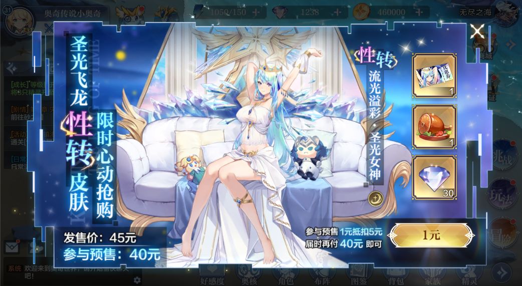 礼包内容:圣光女神皮肤预售,售价:1元,礼包内容:圣光女神优惠券*1、顶级限量脆皮腿*1、钻石*30。