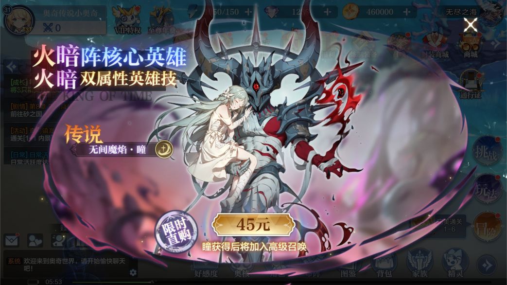 活动内容:火暗阵核心英雄——【无间魔火·瞳】,限时特惠直购,售价:45元。
