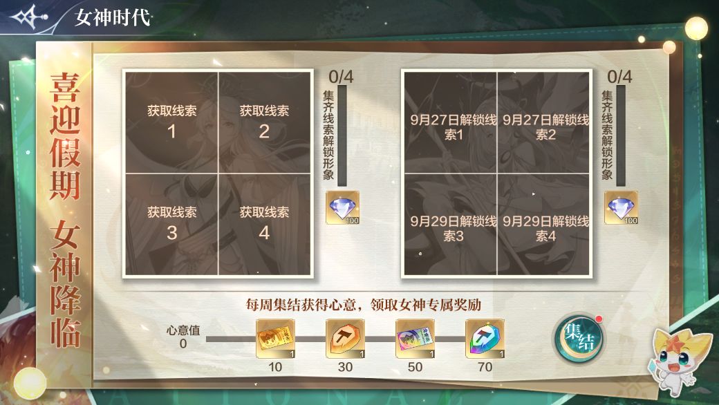 活动内容:通过线索集结获得心意值,每集齐4线索可以获得100钻石奖励,累计心意值可领取女神专属奖励。