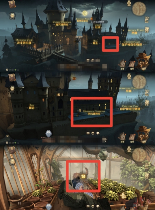 拼图位置:城堡外部向着舞会与保护神奇生物课中间飞去→看到草药课教室→进入草药课教室→原地不动即可看到图标