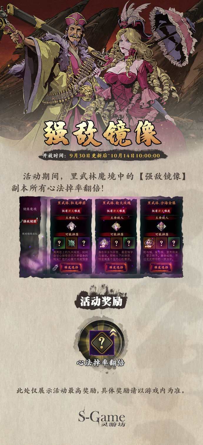 活动期间,里武林魔境中的[强敌镜像]副本所有心法掉率翻倍!