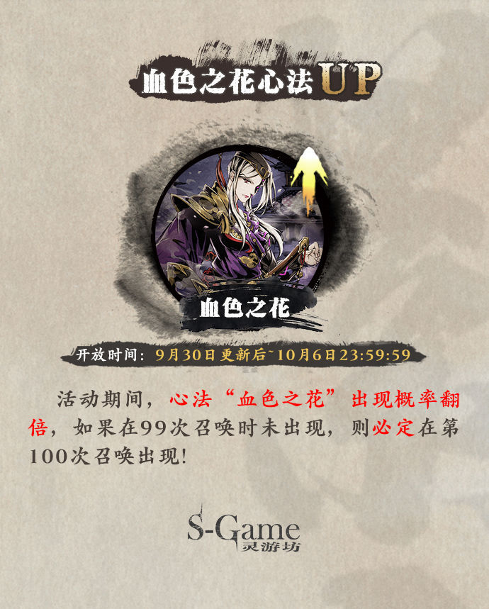 活动期间,心法“血色之花”出现概率翻倍,如果在99次召唤时未出现,则必定在第100次召唤出现!