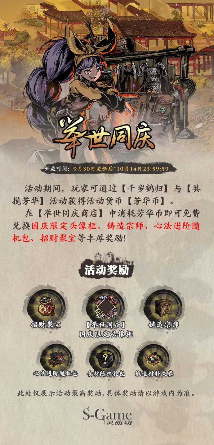 活动期间,玩家可通过[千岁鹤归]与[共揽芳华]活动获得活动货币[芳华币]。在[举世同庆商店]中消耗芳华币即可免费兑换国庆限定头像框、铸造宗师、心法进阶随机包、招财聚宝等丰厚奖励!