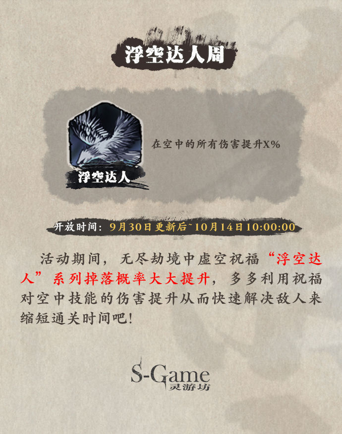 活动期间,无尽劫境中虚空祝福“浮空达人”系列掉落概率大大提升,多多利用祝福对空中技能的伤害提升从而快速解决敌人来缩短通关时间吧!