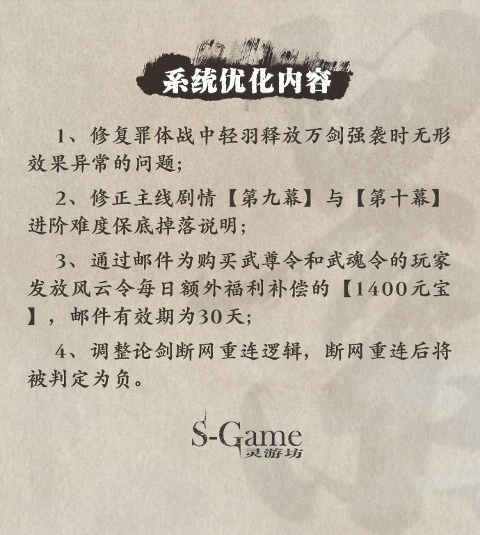 3、通过邮件为购买武尊令和武魂令的玩家发放风云令每日额外福利补偿的[1400元宝],邮件有效期为30天;