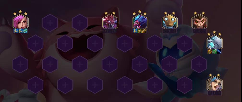 棋子构成:皮城执法官(蔚)、虚空恐惧(大虫子)、虚空遁地兽(挖掘机)、蒸汽机器人、齐天大圣、雷霆之主(狗熊)、冰川骑士(猪妹)/灵鸟毕方(冰鸟)。