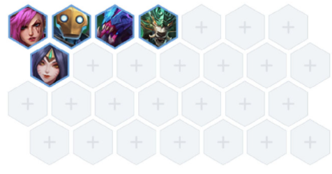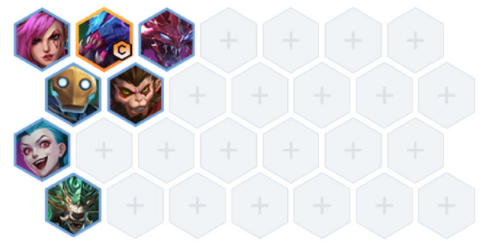 虚空恐惧(大虫子)顶在最中间受伤害能提前打出控制,狼人防刺客和机器人,皮城执法官(蔚) 对角打c位,暴走萝莉(金克斯)补输出,虚空遁地兽(挖掘机) 活到最后单挑所有。