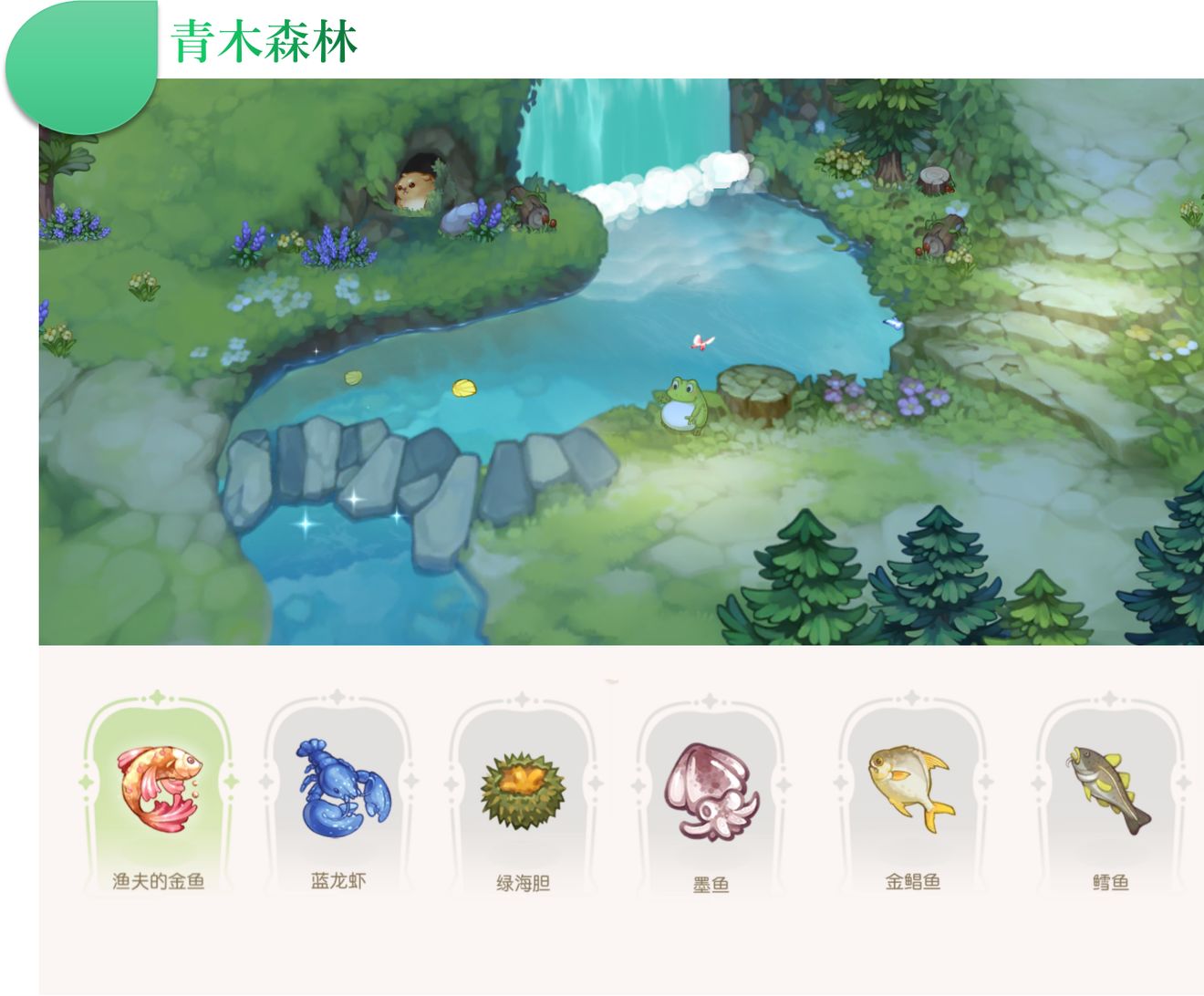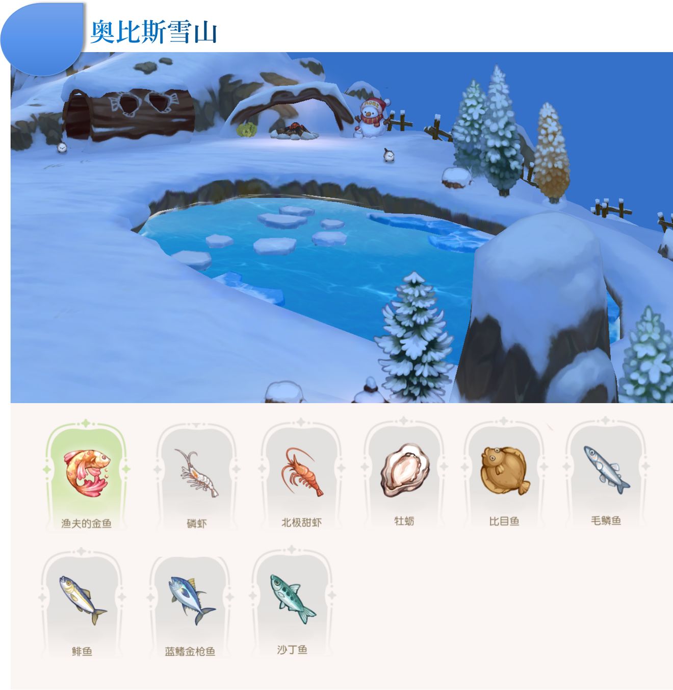 钓鱼位置一共有四处,分别为青木森林3处、奥比斯雪山1处