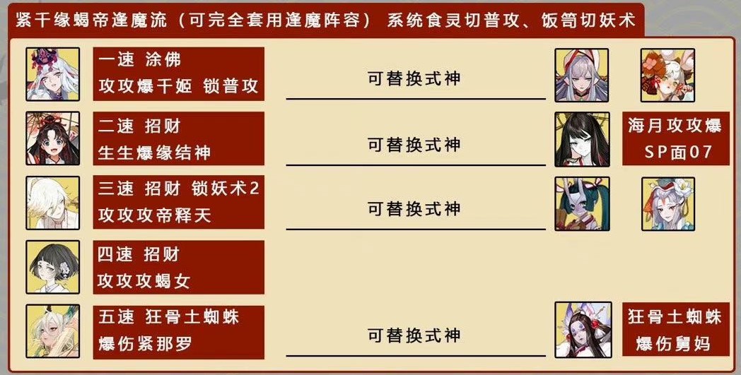 图中就是推荐的阵容了,玩家们如果没用对应的式神可以根据提示替换下位式神。
