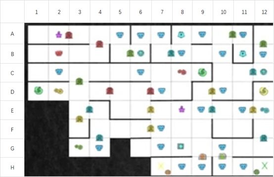 2、 开启齿轮后可以看到E3和F3之间的黄门开启,来到F3拿到宝箱。并返回D1的传送阵,通过D1传送阵来到H12,并破坏机关。