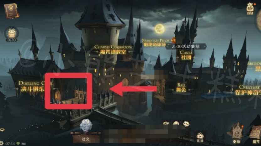 在城堡上空,然后去往礼堂的方向,可以我们的剑圣【纳威】在门口等你
