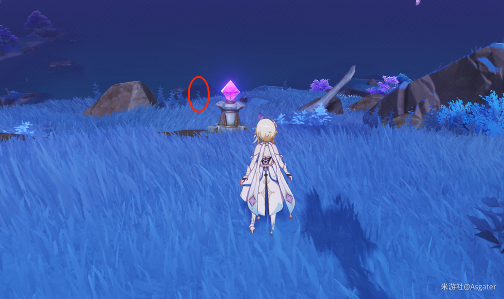 ②传送至路线图中的传送锚点之后,根据下图圈出的标记,到达这棵植物所处的位置。