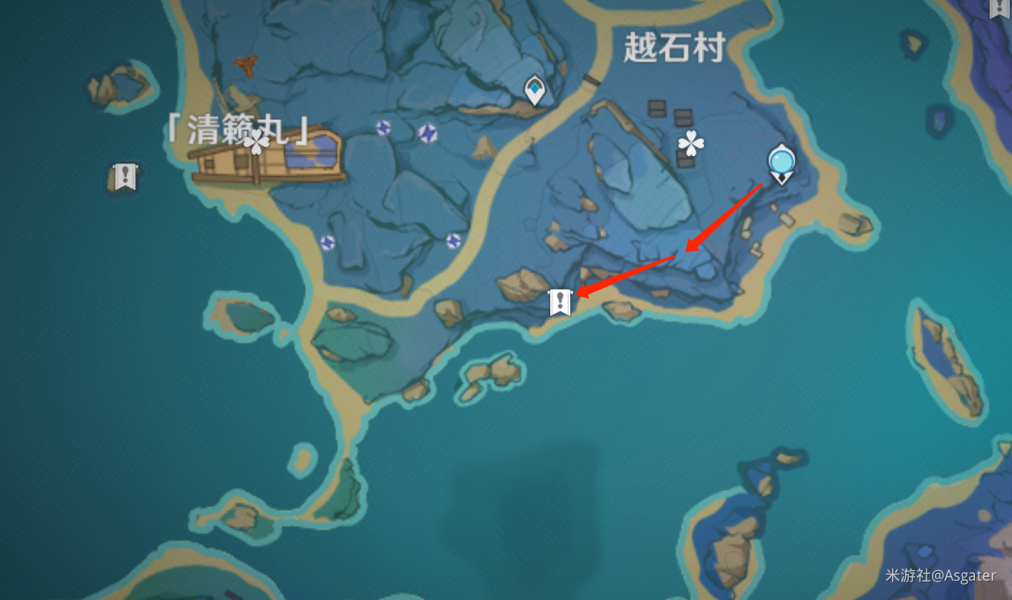 从越石村西侧传送锚点处向西抵达清籁丸地区之后的西侧的一处沿岸的石板处,将拍摄视角转向东方向即可: