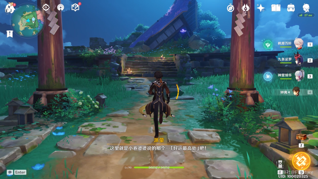 四下环顾这所谓的「好运最高处」,似乎也只有周围这一圈石灯有些突兀,不如我们尝试把这些石灯点亮看看吧。不过附近并没有雷樱枝条,因此我们需要用雷灵来解锁石灯。