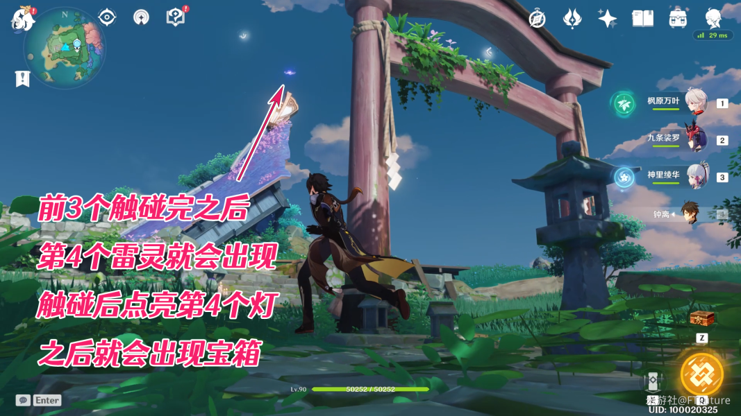 触碰完鸟居的2个雷灵后再回头看,废弃神社的顶上又会出现一个雷灵,也就是第4个雷灵,触碰后开启第4个灯,宝箱就解锁了。