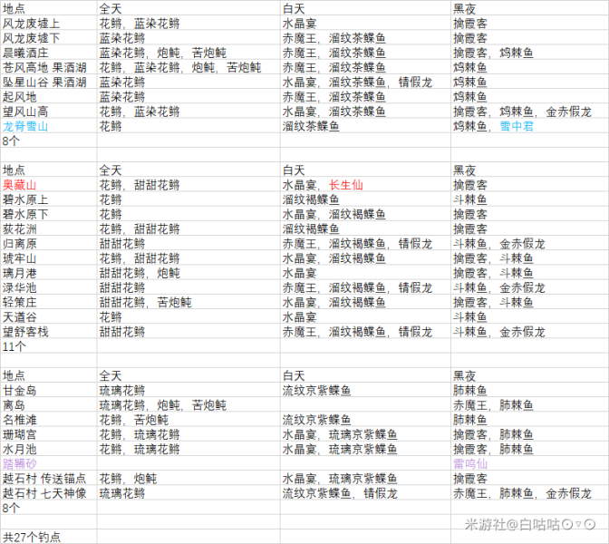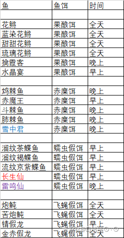 图中就是钓鱼的位置以及不同鱼类的出现时间和需要用到的饵料
