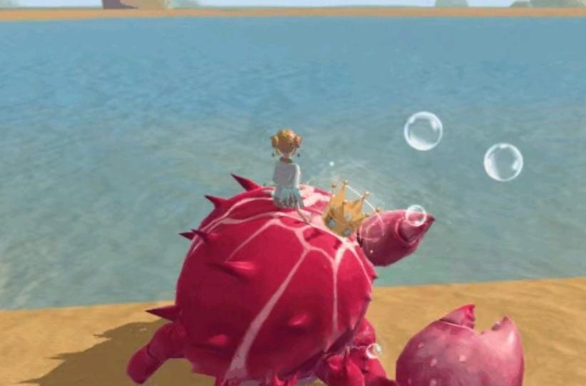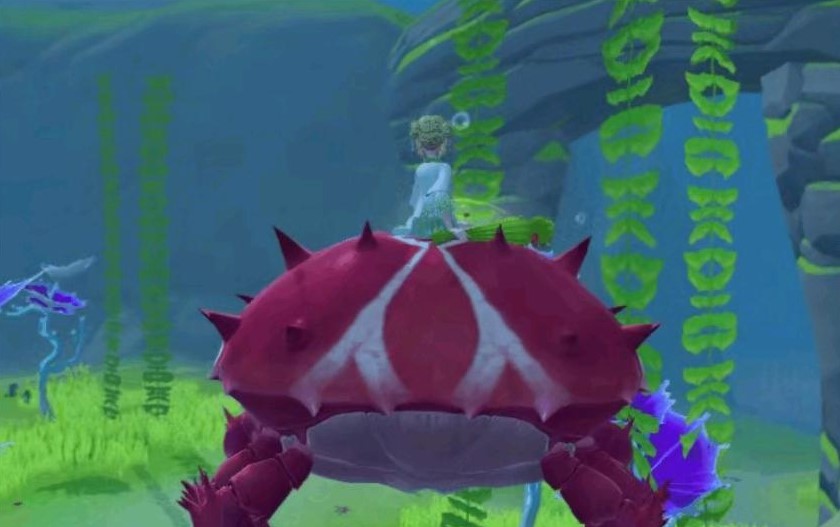 沉眠帝王蟹是水陆两栖坐骑,实用性还是比较高的,行走之时身下水波微漾,蓝色氤氲中小泡泡嘟噜嘟噜飘散,值得一提的是帝王蟹陆地上是横着走的,张牙舞爪横行霸道,在水里却是正着前行。