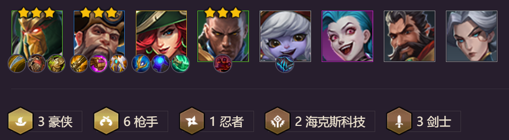 2、阵容分析:3豪侠为金币垫下基础,6枪手羁绊开局火力出击,御界守前排抗伤,海克斯科技开局降低敌方英雄攻速,更好的拖延敌方输出。