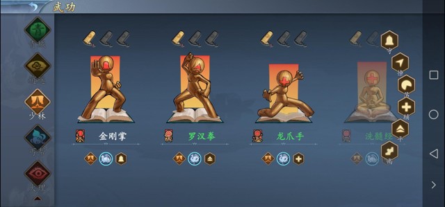 武学是分星级的,有金、银、铜3个级别,3个铜的合成1个银的,3个银的合成一个金的,3个金的之后我没试过,没那么多钱。下图我编辑的从左向右依次是金银铜3种武学的颜色。