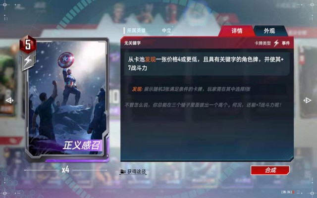 连究极钢铁侠都打出过滤了牌库以后,本卡组4费以下“具有关键字”的“角色卡”剩余 4+2+0+1=6种,正义感召找到德拉克斯、亚当、格鲁特、星鹰的概率是:3*4/6=2倍