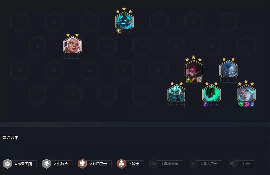 本周运营阵容黑马是铁骑盾武器阵容,吃分场次达到了66场,吃分与吃鸡排名均为第三名,虽说阵容吃鸡占比较低,但吃分稳定,这还是阵容中不包括带有棋子阿克尚的对局。