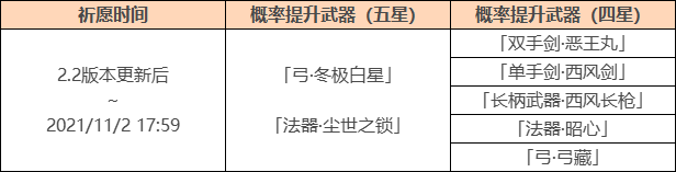 ●活动期间,限定四星武器「双手剑·恶王丸」、四星武器「单手剑·西风剑」「长柄武器·西风长枪」「法器·昭心」「弓·弓藏」的祈愿获取概率将大幅提升。