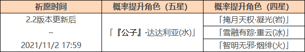 ●活动期间,限定五星角色「『公子』·达达利亚(水)」的祈愿获取概率将大幅提升。