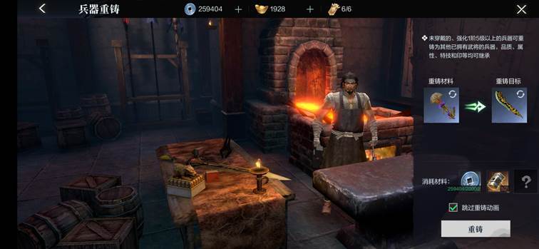 当武将兵器进入到更新阶段,即能够装备下一阶段的兵器时,小霸王们可将未穿戴的、强化1阶5级以上兵器进行重铸,重铸可转化为其他武将的兵器,需要消耗银币和移星锤。重铸将保留原兵器的品质、属性、特技和兵印。