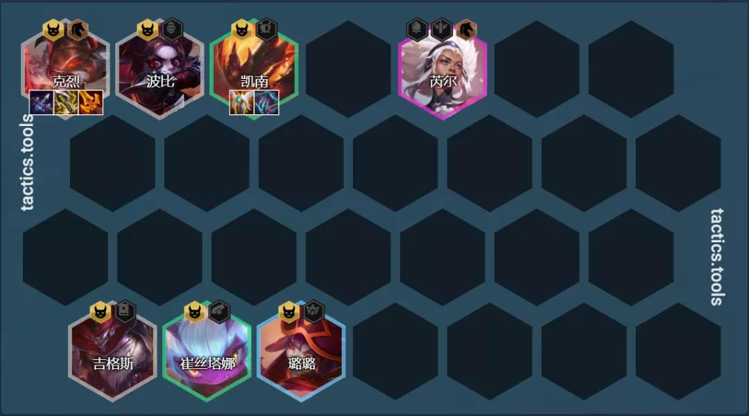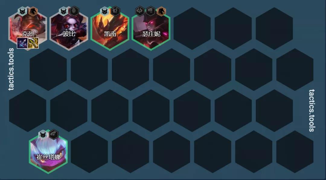 恶魔赌克烈阵容是一套赌狗阵容,核心英雄是克烈和凯南,这两张卡牌越先三星越容易吃分,后期吃鸡主要是看看有没有2星提莫,否则后期阵容没有足够的AOE伤害。
