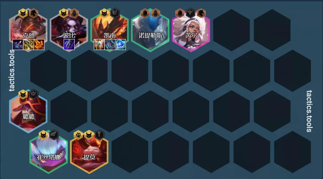 7人口阵容核心是6小恶魔2重骑羁绊,因为我们的阵容核心是克烈,因此2重骑对于克烈还是非常重要的。7人口卡利息继续追3星凯南,凯南3星即可拉8人口,同时也顺便拿一下璐璐。