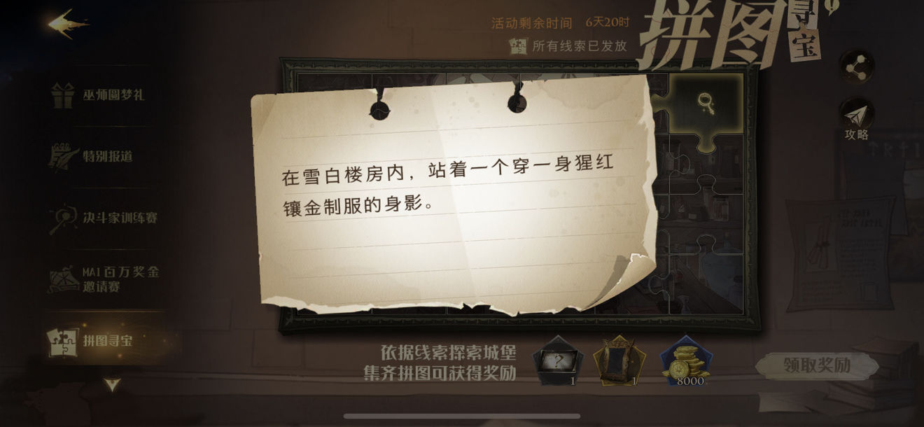 具体的地点在【摩金夫人长袍专卖店】内部柜台上,到达后在柜台上找到中间的金加隆如下图所示。点击金加隆可以获得今天第一块拼图。拼图2:“在城堡里进行魁地奇活动必然会受到严厉的惩罚。”具体地点在【赫奇帕奇公共休息室】的门口,从地图进入【城堡主楼】,向下走一个楼梯即可到达。到达后点击下图所示画像,与弗雷兄弟战斗即可获得。拼图3:“在雪白楼房内,站着一个穿一身猩红镶金制服的身影。”具体地点在【古灵阁】内部的地面上。进入【古灵阁】之后直接转身,向后走一小段距离后可在地面上找到操作光点,与其交互即可获得第三期活动的最后一块拼图啦!Recommend