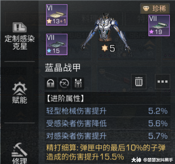 最佳属性是感染者伤害+高度压制/暴击率+轻型武器伤害提升+下图三个