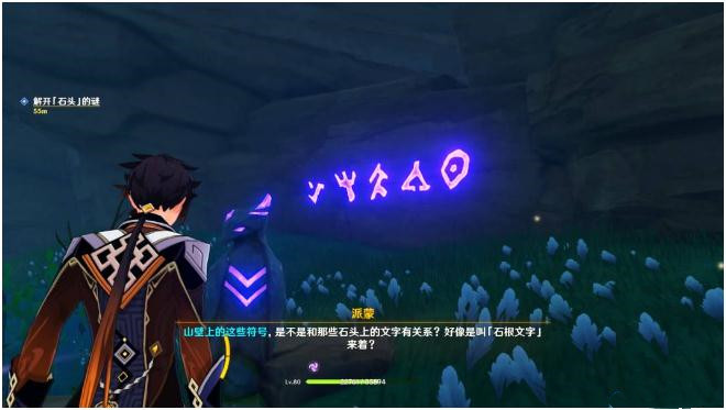 3、解开石头的秘密。使用羽毛会出现雷灵,走到终点有解谜提示。