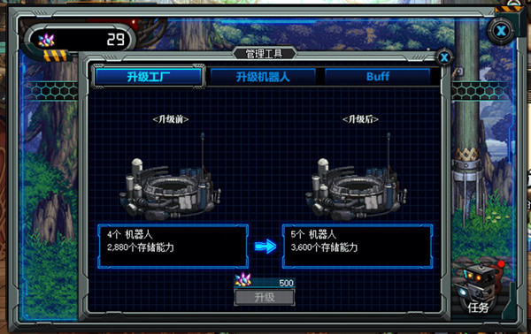 升级矿石工厂可以提升存储的兰迪晶炭的数量及工厂里采矿的追击者的数量,矿石工厂每提升1级,就会新增1只1级追击者,并提升最大存放数量,高级的地图的工厂最高等级也会上升。