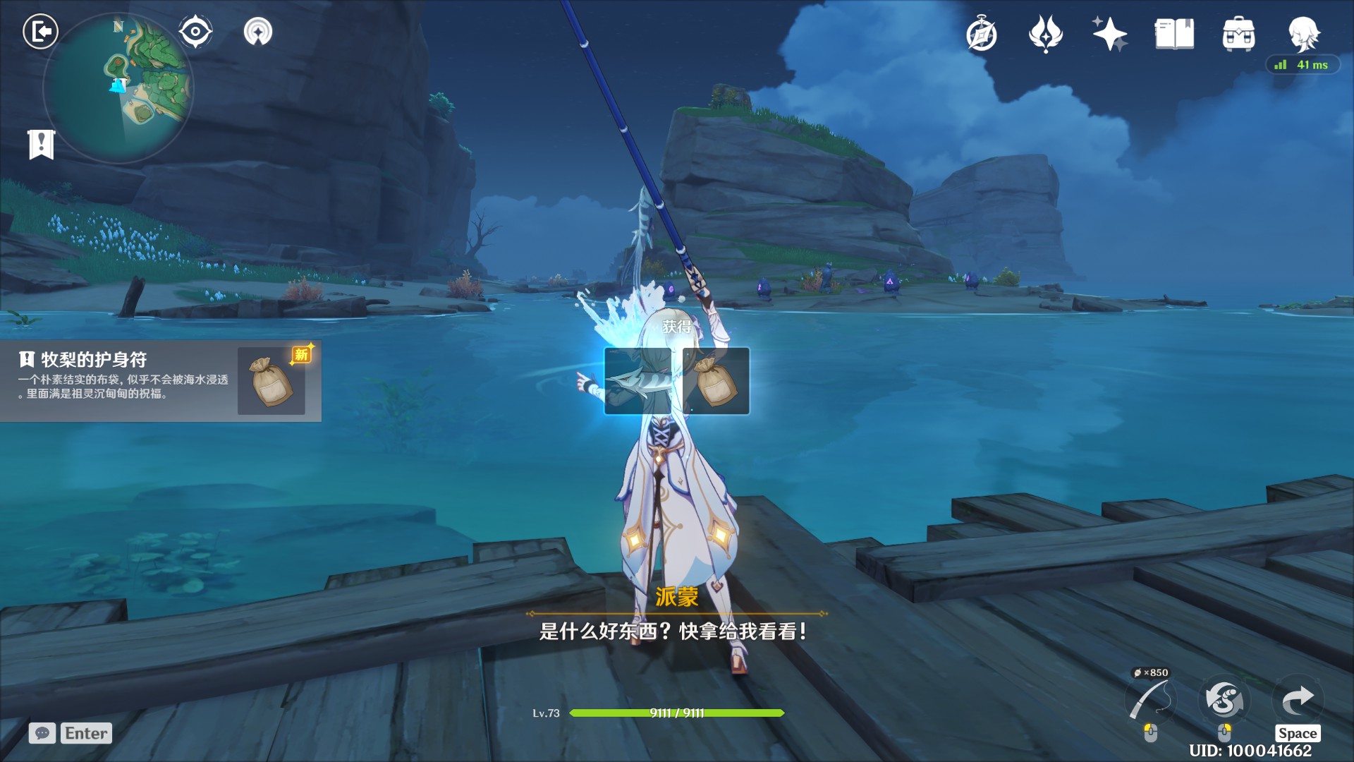 进入钓鱼点钓鱼,直到钓取到任务道具:「牧梨的护身符」