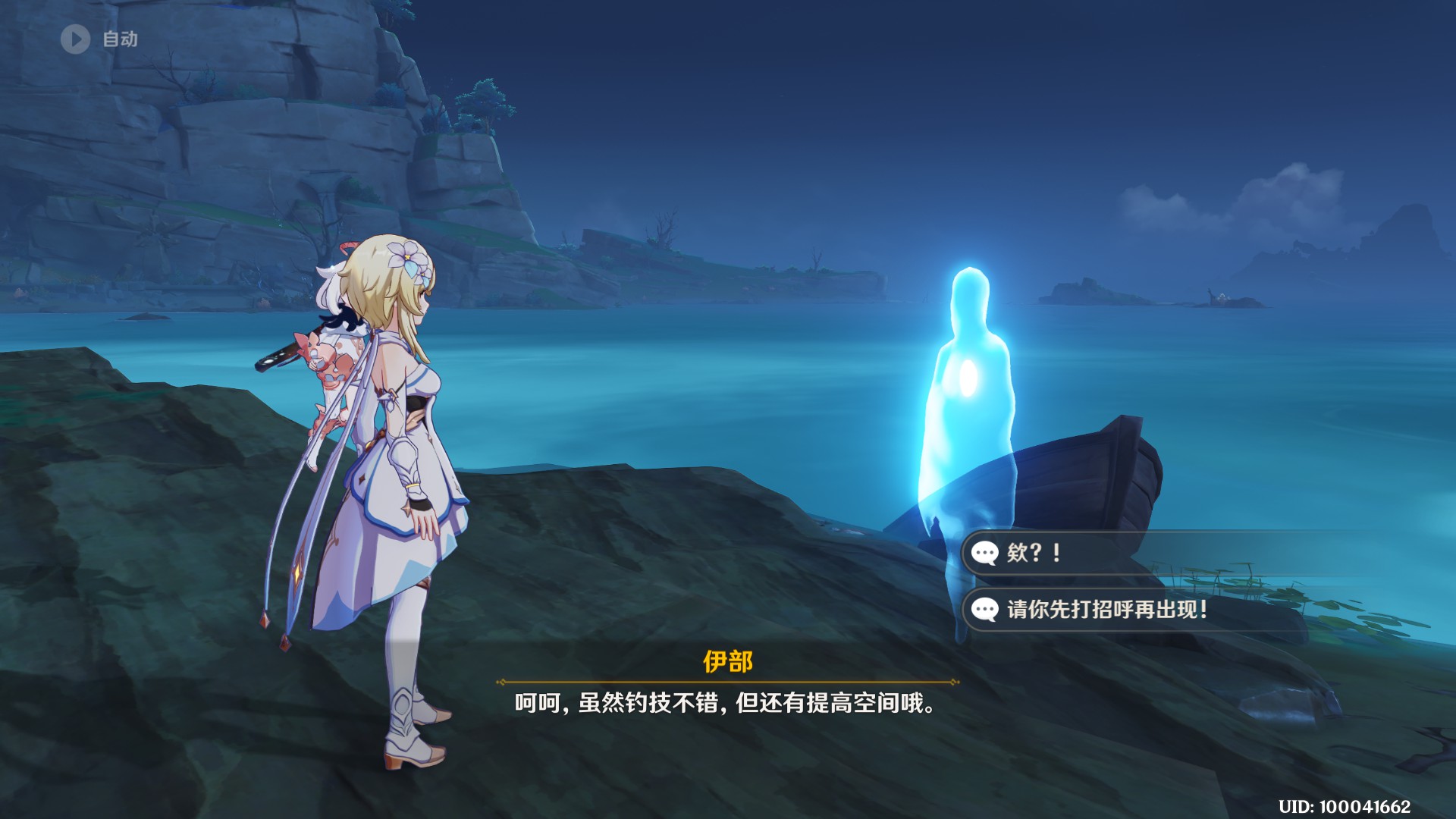 取得任务道具后,回到千来神祠西方向钓鱼点,与「伊布」对话