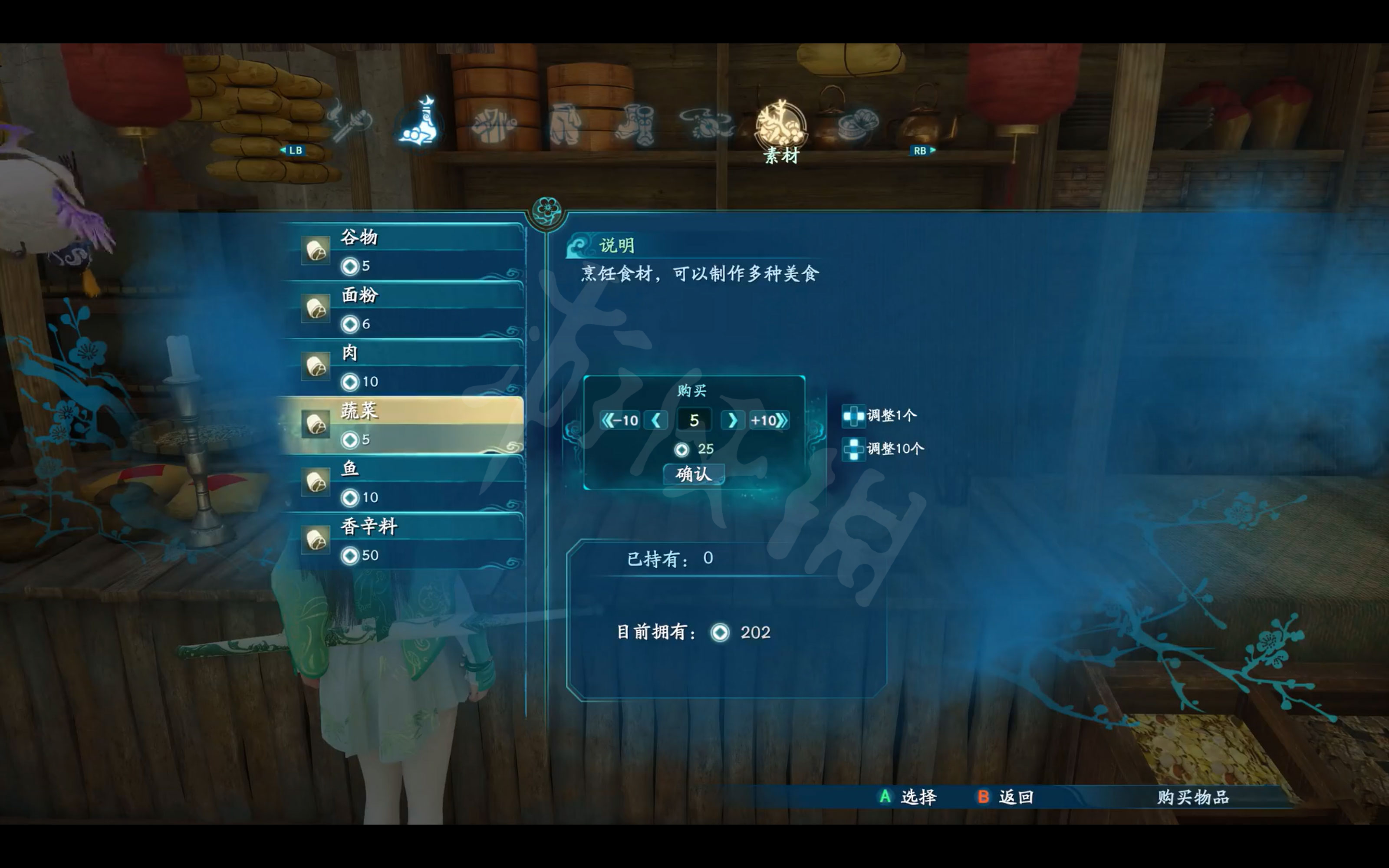 2.去村中的杂货铺,选择购买-素材,购买5颗蔬菜。
