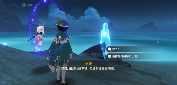 在上图所示位置进行一次钓鱼,然后马上就会有一只魂灵出来对我们的钓技进行点评。