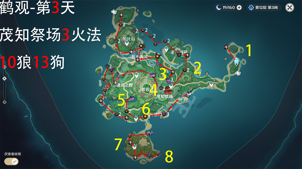鹤观的怪物分布以3天为周期循环变化,参照物为茂知祭场传送点附近的火法师,火法师数量对应鹤观轮回的天数。