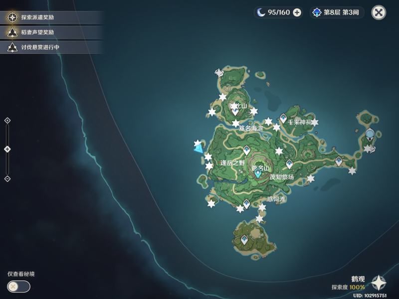 找到鹤观的四张宝藏碎片,去七天神像后边与岻伽对话,会给你一张藏宝图,然后去菅名山里雷鸟像边上挖掘。会给一个珍贵宝箱,30原石呢。