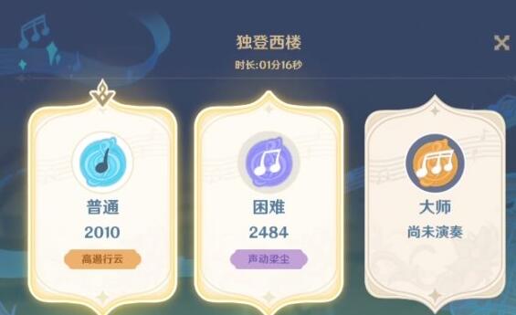原神中的独登西楼这一曲子怎么样?说句实在话,小编觉得这首曲子是目前这个活动以来,最好听的一首,之前的一些都和这首曲子有一些差距,同样也是分为三个困难的档次,当然
